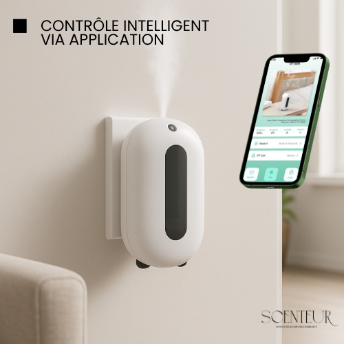 Le diffuseur se connecte via Bluetooth ou Wi-Fi et se contrôle directement depuis l’application mobile (l'application et toute les instructions vous sont donner après confirmation de commande).